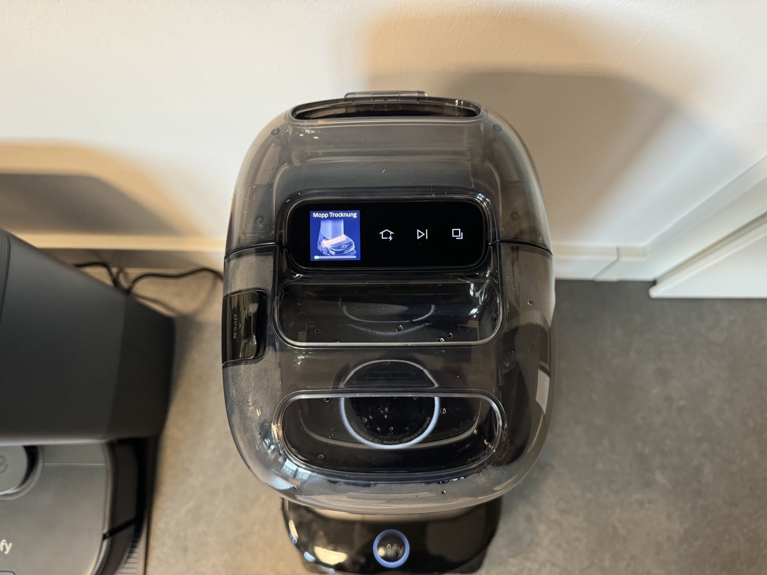 Futuristisch ist auch die eine oder andere Technik, die in der Basisstation steckt. Damit meine ich nicht unbedingt das Farb-Display, auf dem auch Status-Informationen angezeigt werden, sondern den eingebauten Ozongenerator. Das so erzeugte Ozon soll dazu verwendet werden, um Boden und Sauger zu desinfizieren. Ob das tatsächlich etwas bringt? Ich kann es euch wirklich nicht sagen. Falls ihr eher an die klassischen Techniken glaubt: Zum Frischwasser wird auch automatisch eine Reinigungslösung aus einem kleinen Tank hinzugefügt.