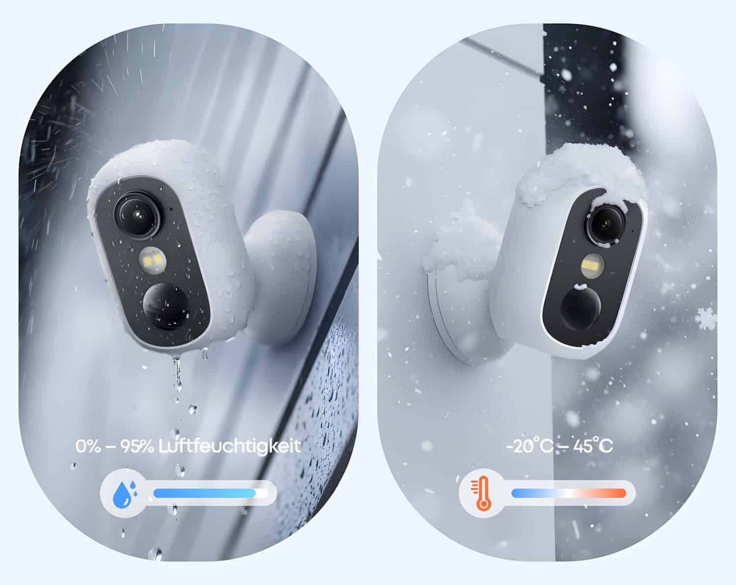 Das Eufy C35-System ist kabellos, und kann magnetisch befestigt, verschraubt oder einfach aufgestellt werden, und ist zudem nach IP67 wasser- und wetterfest. Damit lässt sich mit dem Set auch eine Kombination aus Innen- und Außen-Überwachung realisieren. Über die „PureColor Vision“-Funktion werden auch in der Nacht natürliche und detailreiche Videoaufnahmen möglich gemacht, ganz ohne Scheinwerfer oder eine Infrarot-Nachtsicht-Kamera.
