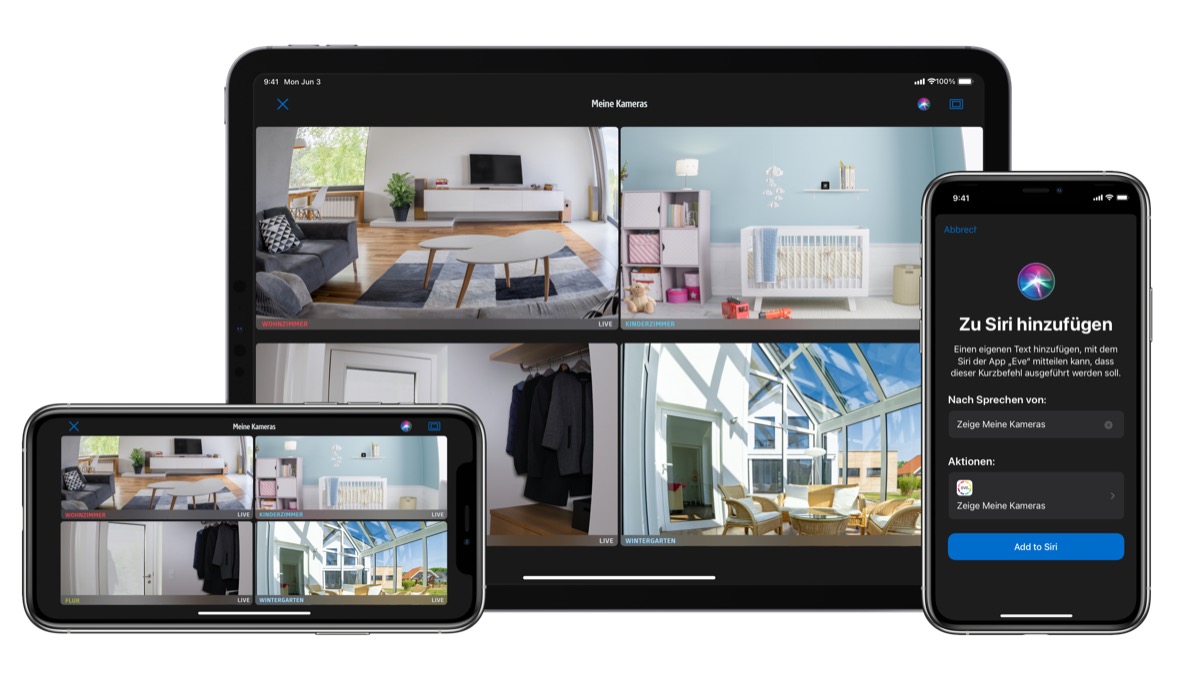Außerdem gibt es in der Eve-App eine neue Kachel „Meine Kameras“, die immer dann aktiviert wird, wenn ein Zuhause über mehr als eine Kamera verfügt. Diese Ansicht aller Kameras kann auch ganz einfach mit einem Siri-Kurzbefehl geöffnet werden und ermöglicht einen schnellen Überblick über das ganze Zuhause. Auch hier hat Eve Systems praktische Extras versteckt: Man kann in Kamerabild antippen, um dieses groß anzuzeigen, oder tippen und halten um Szenen und andere HomeKit-fähige Geräte im gleichen Raum zu aktivieren.#