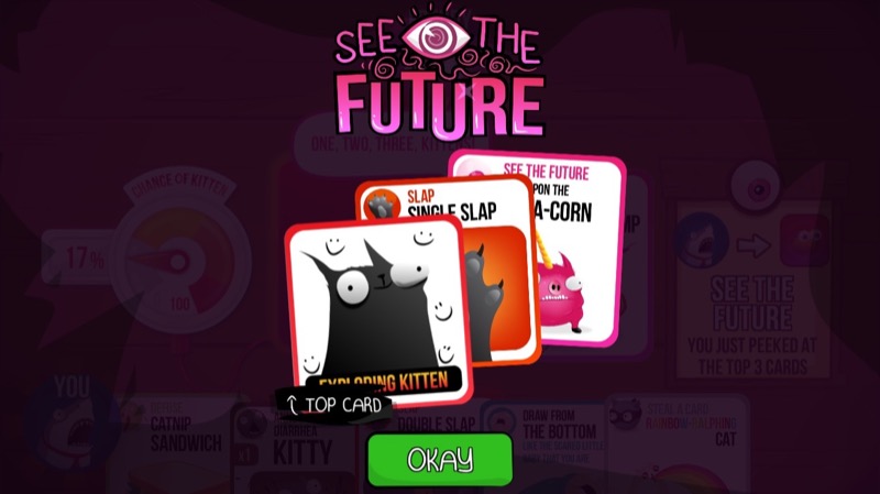 Was kompliziert klingt, ist im Prinzip ganz einfach. Exploding Kittens verfügt zudem über ein kleines Tutorial, das die Regeln in drei Schritten erklärt. So ist man nach weniger als einer Minute für das erste Duell bereit – und so sollte es auch sein.