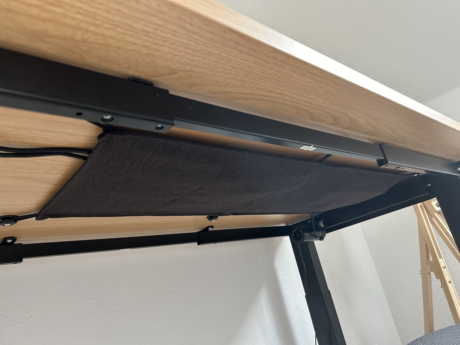 Praktisch ist auch das mitgelieferte Kabelmanagement-Tuch, unter dem die Kabel auf der Unterseite des Tisches gut und vor allem nicht sichtbar aufgehoben sind. Ebenfalls gut gefällt mir, dass man selbst entscheiden kann, an welcher Stelle das Bedienelement angebracht wird, über das man die Höhe des Schreibtisches regulieren kann. Ich habe mich für die linke Seite entschieden.