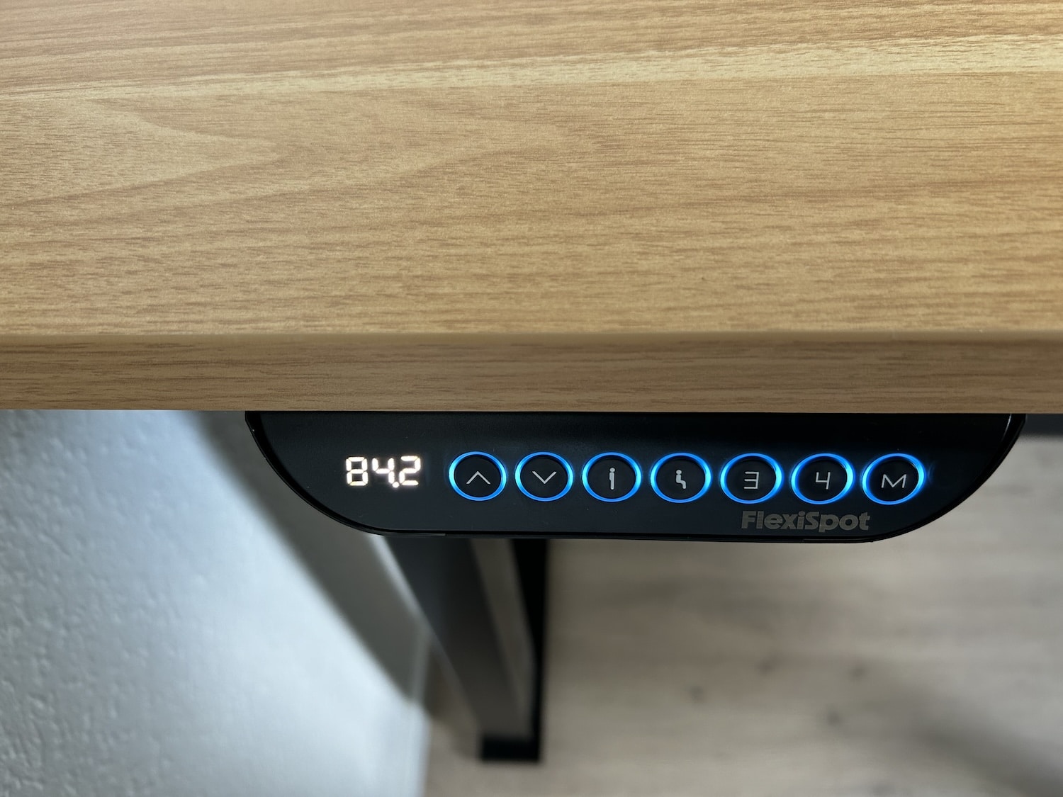 Die Höhe des Flexispots lässt sich stufenlos per Druck auf die Pfeiltasten einstellen. Der Tisch fährt dann angenehm leise rauf oder runter. Ihr könnt zwischen einer Höhe von 73 bis 123 cm wählen. Zudem habt ihr die Möglichkeit, eure eigene perfekte Stehhöhe und auch eure Sitzhöhe auf den dazugehörigen Knöpfen zu hinterlegen, sodass der Flexispot per einmaligem Knopfdruck auf die richtige Höhe gefahren wird, wenn ihr die Position wechseln wollt. Insgesamt bietet der Tisch vier Memory-Speicherplätze an, sodass ihr auch weitere Höhen konfigurieren könnt.