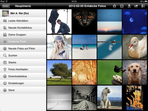Insbesondere auf dem iPad macht FlickStackr sofort einen wirklich guten, aufgeräumten Eindruck, außerdem sind alle Inhalte in deutscher Sprache vorhanden. In einem Hauptmenü kann man nicht nur gerade hochgeladene Fotos von anderen Nutzern in einer Thumbnail-Galerie einsehen, sondern in einer „Entdecke Flickr“-Galerie einige wirklich hochwertige Fotos des Online-Dienstes, oder auch Gruppen und eigene Kontakte anzeigen lassen.