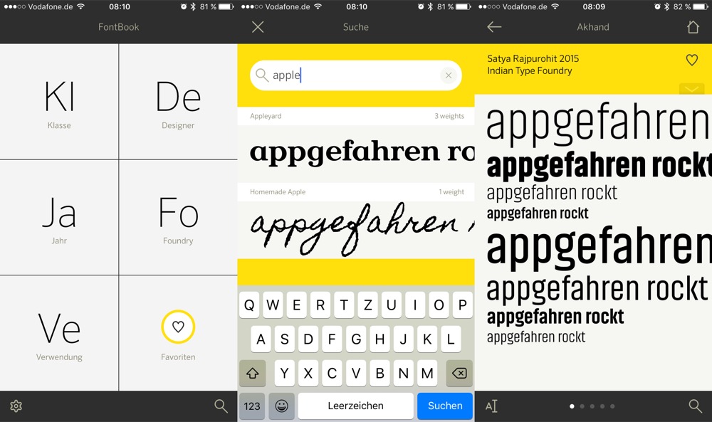 Das Resultat in der App: „Die international mehrfach ausgezeichnete FontBook-App dokumentiert den Bestand von 150 internationalen Font-Herstellern, die 1805 Schriftentwerfer herausgeben – das sind 46.718 Fonts in 9479 Familien“, heißt es in der Beschreibung der App, die erst Anfang des Monats mit einem umfangreichen Update ausgestattet wurde.