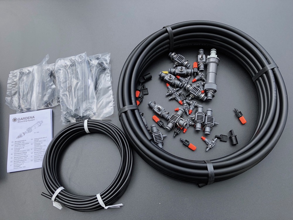 Aber wie steht es nun im meine Kartoffeln, Zwiebeln und Kräuter? Das ganze Grünzeug wächst und gedeiht dank der Bewässerung mit dem Micro-Drip-System (Hersteller-Webseite) wunderbar. Ich hatte zuvor gar keine Ahnung, dass es ein solches System überhaupt gibt, mich hat es aber auch Anhieb überzeugen können. Okay, vielleicht nicht direkt auf Anhieb, denn nach dem Auspacken hat man nicht nur einige Schläuche, sondern auch eine ganze Menge Kleinkram vor sich und muss sich erst einmal einen Überblick verschaffen.