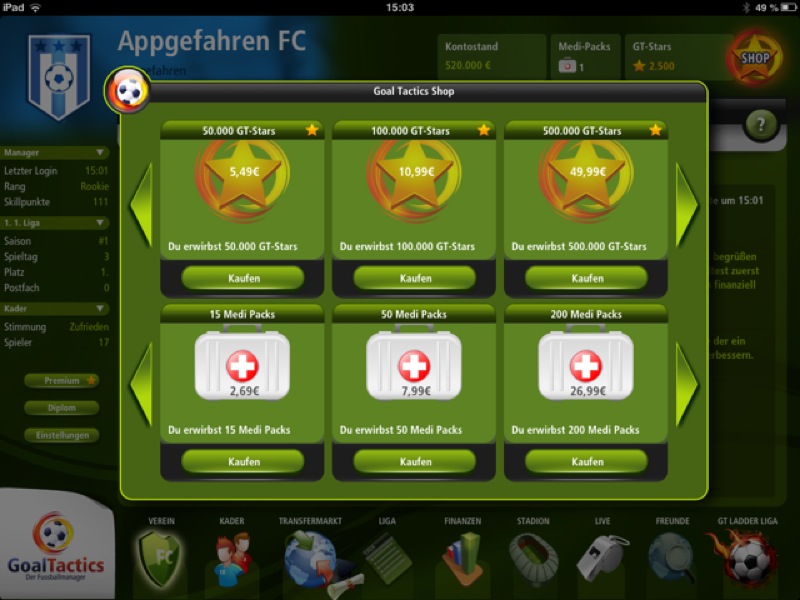 Aktuell sieht die Sache wie folgt aus: Mit einem Premium-Account erhält man nämlich nicht nur Trikotnummern für die Spieler oder kann eigene Spielernamen vergeben (das hat wirklich keinen Einfluss auf das Spiel), sondern bekommt auch mehr Filter auf dem Transfermarkt und doppelte Skillpunkte. Zudem kann man den Ausbau eines Stadions durch den Einsatz von kostenpflichtigen GT-Stars beschleunigen. Im Shop findet man zudem Medipacks, die vermutlich für eine schnellere Genesung verletzter Spieler dienen. Inwiefern das über einen längeren Zeitraum Einfluss auf das Spiel nimmt, können wir zum jetzigen Zeitpunkt noch nicht abschätzen.