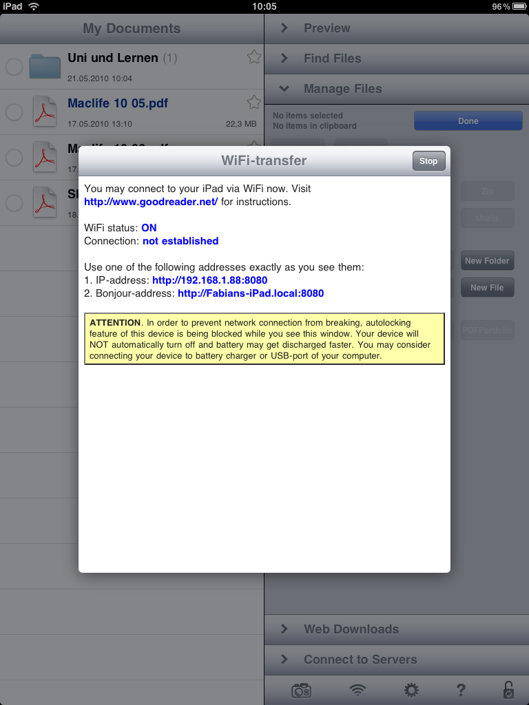Hochauflösende Bilder, Webseite, Word- und Pages-Dokumente, sogar Audio und Videodateien können mit dem Goodreader geöffnet werden. Dabei führen viele Wege in das Programm – nicht nur per iTunes, sondern auch über die iPad-interne Datei-Weitergabe oder direkt aus dem Internet und über Webserver. Einfacher kann es eigentlich nicht gehen, selbst über WLAN ist der Goodreader erreichbar.