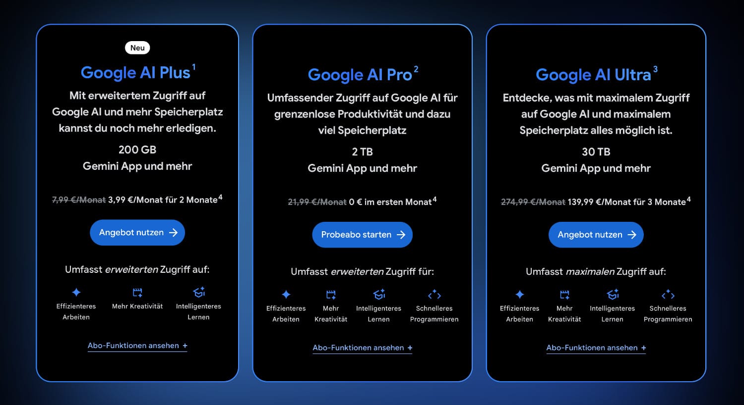 Neben Google AI Plus gibt es noch die beiden bestehenden Optionen Google AI Pro, das 2 TB Speicherplatz bietet und für 21,99 Euro/Monat verfügbar ist, ebenso wie Google AI Ultra, das über 30 TB Speicherplatz verfügt und regulär 274,99 Euro/Monat kostet. Der neue Tarif Google AI Plus kostet im Normalfall 7,99 Euro/Monat, kann aber zur Einführung derzeit bei Google zum Preis von 3,99 Euro/Monat für zwei Monate gebucht werden.
