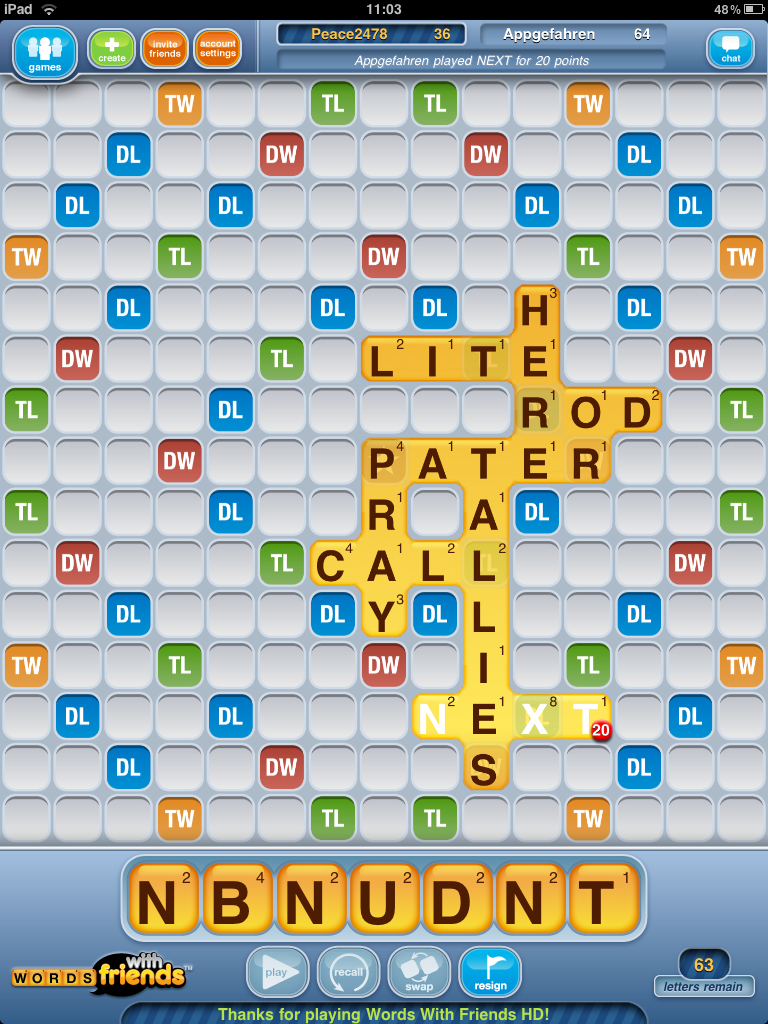Wenn man gerade nicht am Zug ist, kann man Words with Friends HD ohne Probleme beenden. Per Push-Benachrichtigung wird man darauf aufmerksam gemacht, wenn man wieder an der Reihe ist. Das funktioniert auch mit einem Wifi-iPad im StandBy erstaunlich gut. Wer nicht so lange warten will, kann auch mehrere Spiele gleichzeitig starten.