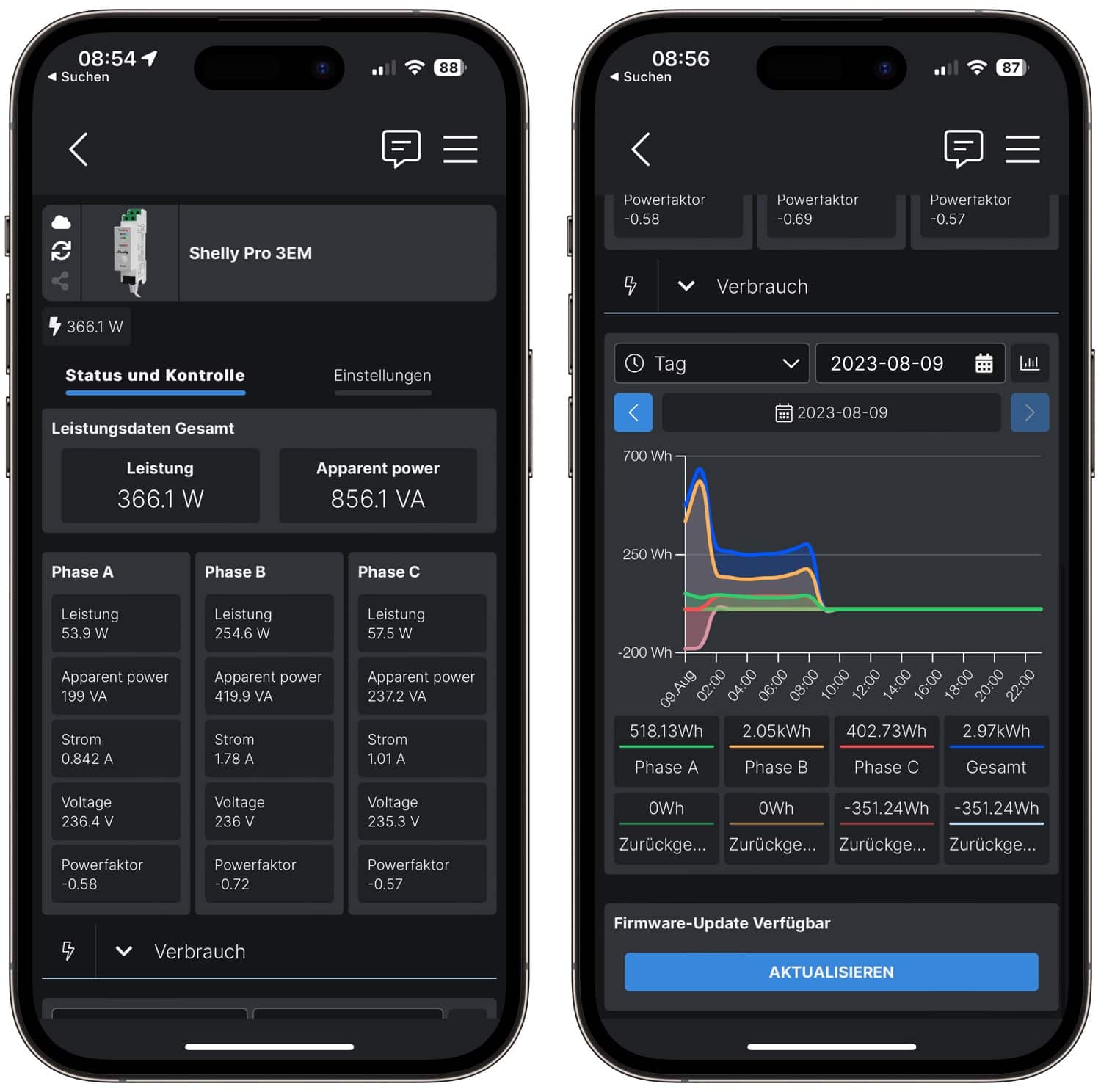 In der Shelly-App kann man dann auf die aktuellen Messwerte zugreifen. Außerdem können Verbrauchsstatistiken abgerufen werden, die selbst bei einem kurzzeitigen Ausfall des WLANs oder Internets immer vollständig bleiben. Der Shelly Pro 3EM speichert die Messwerte für 60 Tage, so dass sie auch nach einem Ausfall noch in die Cloud geladen werden können, falls ihr das möchtet.