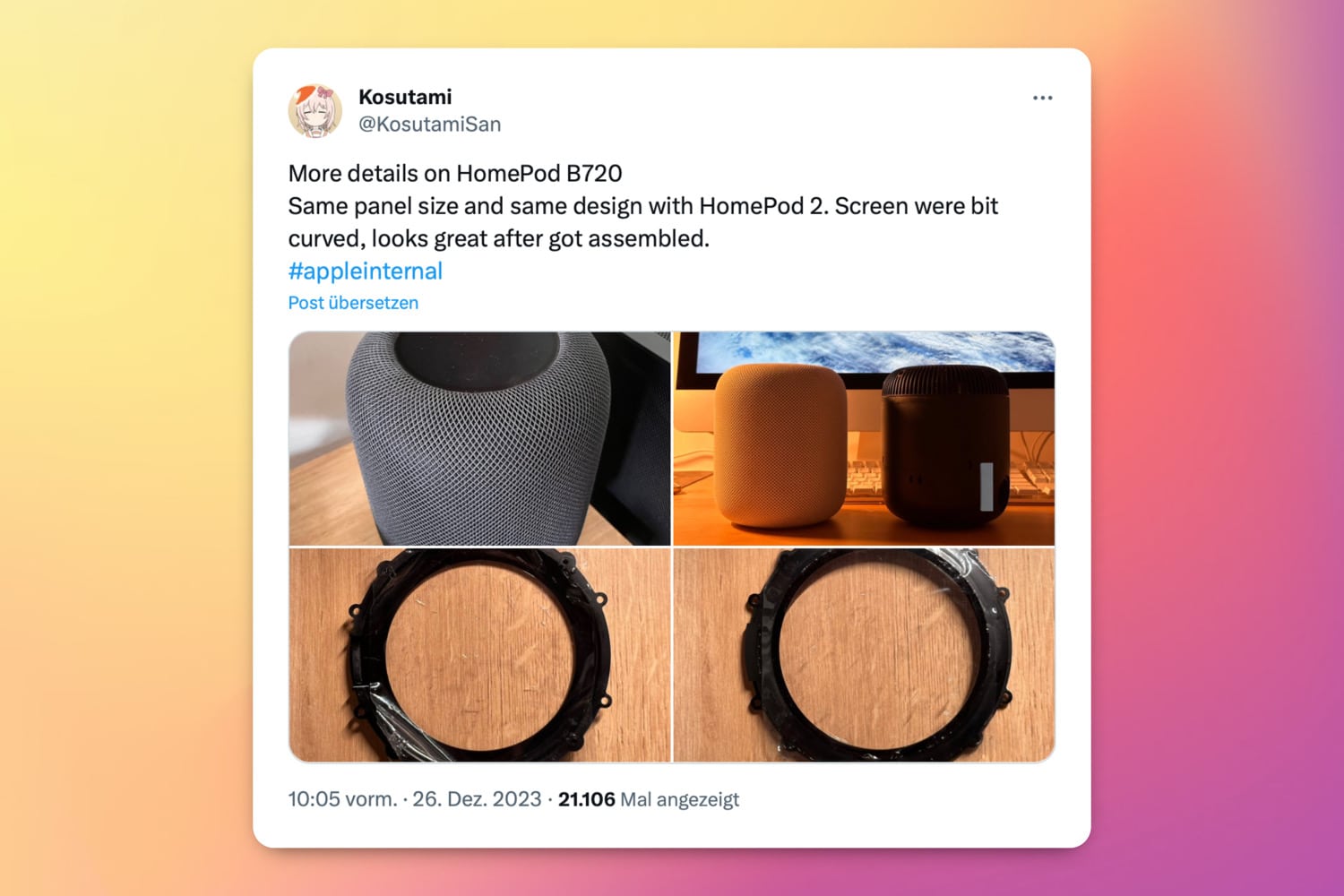 Schon vor ein paar Monaten teilte der Apple-Sammler und Leaker Kosutami die ersten Bilder eines HomePod-Prototyps mit einem LCD-Panel auf der Oberseite. Die Fotos wurden nach der Veröffentlichung bestätigt: Unabhängige Quellen gaben an, dass der Prototyp wahrscheinlich eine kommende Generation des HomePods ist. Kosutami meldet sich nun mit weiteren Bildern des HomePod-Prototyps mit einem LCD zurück.