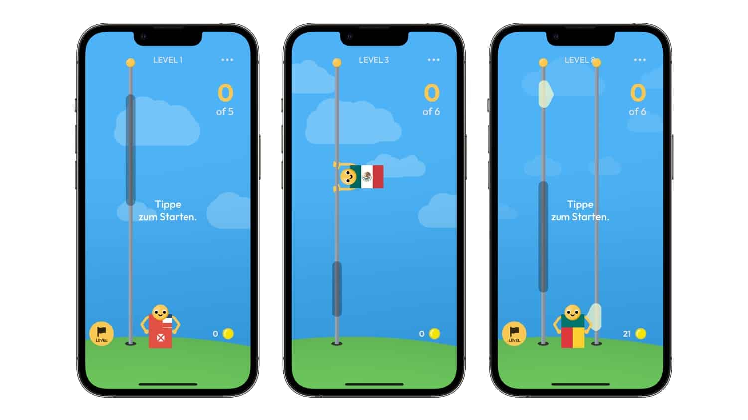 In Human Flag schlüpft ihr in die Rolle eines in einer Landesflagge gekleideten Männchens, dass an einer Fahnenstange hoch- und wieder runterrutscht. Gleichzeitig bewegt sich auch ein grauer Balken die Fahnenstange entlang. Immer wenn sich Männchen und Balken treffen, gilt es, auf den Bildschirm zu tippen. Pro Runde müsst ihr dabei im Schnitt fünf bis sechs Mal zur richtigen Zeit tippen, um das Level zu meistern. Das ist anfangs recht einfach, wird aber im Spielverlauf zunehmend schwerer. Tippt ihr den Bildschirm zur falschen Zeit an, stürzt das Männchen von der Stange und ihr müsst von vorn beginnen.