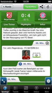 Nett sind auch die folgenden beiden neuen Funktionen: Man kann den Live-Ticker für ausländische Spiele nun auch in der Landessprache anzeigen lassen – man bekommt nicht nur eine umfangreichere Berichterstattung, sondern kann auch noch etwas lernen. Die aktuellen Spielstände kann man nun auch wieder über Twitter oder Facebook teilen.