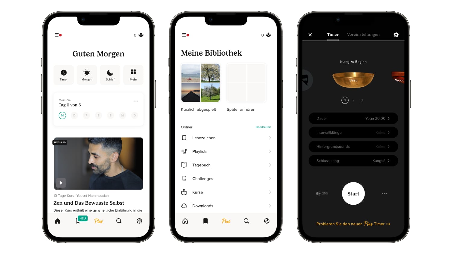 Seither hat sich das Leistungsspektrum der App allerdings um ein Vielfaches erweitert. So könnt ihr die App zwar immer noch „nur“ als Timer nutzen, ihr könnt aber auch auf die „weltweit größte kostenlose Bibliothek“ geführter Meditationen zugreifen, eure Stimmungen tracken, euch in der Insight-Timer-Community beteiligen und – in der Plus-Version – an vielen interessanten Online-Kursen und -Workshops teilnehmen, die von Psychologen, spirituellen Lehrern und Achtsamkeit-Coaches gegeben werden und teilweise auch live stattfinden.