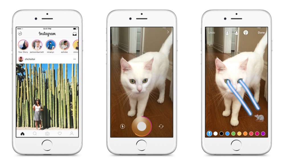 Knapp drei Jahre später hat Facebook aus Instagram Snapchat gemacht. Das komplette Konzept hat man einfach zu 99 Prozent kopiert und in Instagram eingebaut. Die Funktion heißt nicht nur gleich, sondern verhält sich auch so. Nutzer können 15 Sekunden lange Videos in einer Story veröffentlichen, die nach 24 Stunden automatisch wieder gelöscht wird. Auch die Filter, Effekte und Bearbeitungsmöglichkeiten sind exakt gleich.