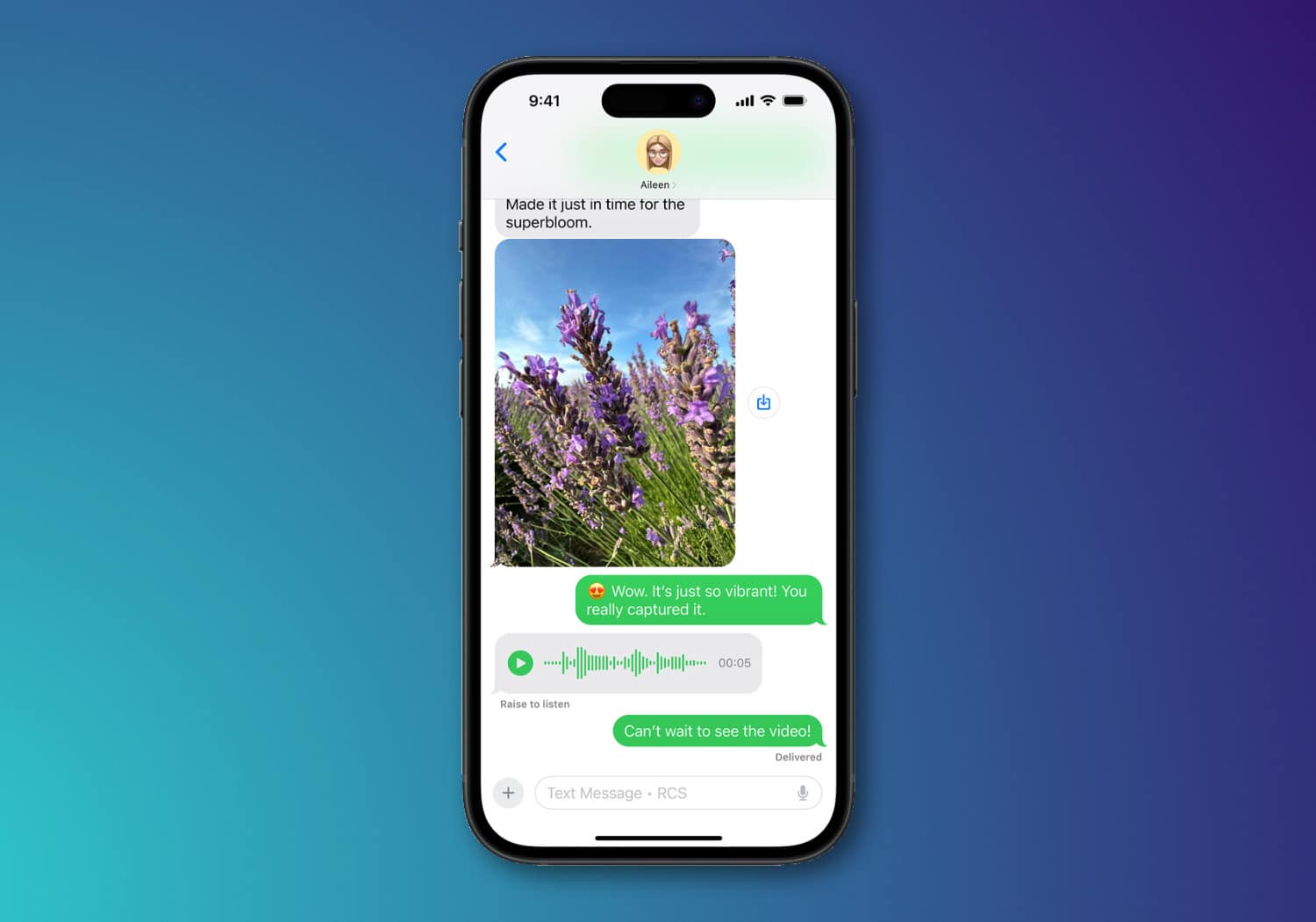 Mit RCS können iPhone-User Rich Messages mit Audio- und größeren Mediendateien an Personen mit Android-Geräten senden. RCS bietet auch Lesebestätigungen, die bisher nur in iMessage und anderen Instant-Messaging-Apps verfügbar waren. Obwohl RCS-Nachrichten immer noch grüne Sprechblasen haben, zeigt die Nachrichten-App in der Konversation die Bezeichnung „Textnachricht – RCS“ an.