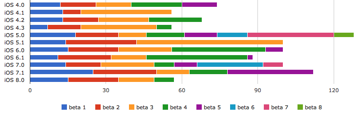 2013 ist die fünfte Beta von iOS 7 ebenfalls nur acht Tage nach der vorherigen Version veröffentlicht worden, das wäre heute. 2012 hat Apple gänzlich auf iOS 6 Beta 5 verzichtet und stattdessen 37 Tage nach der vierten Beta die Golden Master – die finale Version – an die Entwickler verteilt. Die meisten Beta-Versionen gab es übrigens bei iOS 5, damals hat Apple vorab sieben Software-Updates verteilt, bevor das System veröffentlicht wurde. Einen sehr guten Überblick erhaltet ihr in der eingebundenen Grafik von Thinkybits, auf der die Golden Master aber nicht gesondert gekennzeichnet wurde (abgesehen von iOS 8 jeweils die letzte Beta).