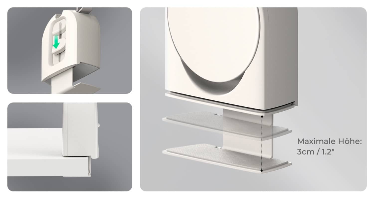 Der federbelastete Montagebügel lässt sich mit einem Handgriff an Klapptischen, Regalböden oder Arbeitsplatten befestigen und ebenso schnell wieder lösen. Ein dreh- und schwenkbarer Arm ermöglicht flexible Ausrichtung im Hoch- oder Querformat, während eine weiche Silikonauflage das Gerät schützt und sicheren Halt gewährleistet.
