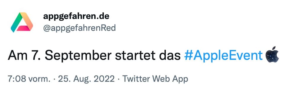Passend zum kommenden Event gibt es bei Twitter mal wieder ein Hashflag. Hinter dem Hashtag #AppleEvent wird dann automatisch ein Apple-Logo im Design der Einladung angezeigt.