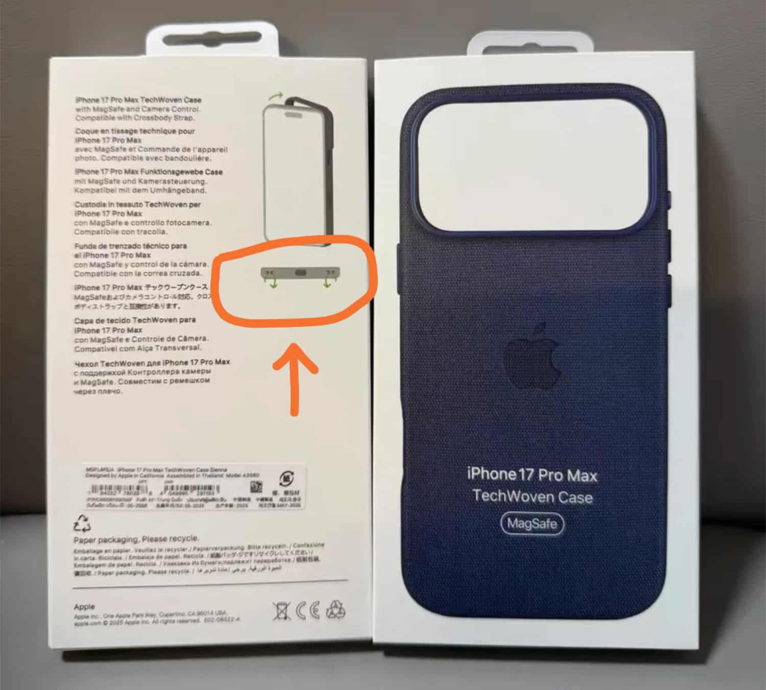 Sonny Dickson hat bei X gleich zwei Fotos dieses neuen Zubehörs in einer knalligen orangenen Farbe geteilt. Das rund einen Zentimeter breite und doppelt gesetzte Band kommt mit silberfarbenen Elementen und Möglichkeiten zur individuellen Einstellung daher. Das Design des Crossbody Straps deckt sich darüber hinaus auch mit vorherigen Leaks einer „Tech Woven“-Case-Verpackung für das iPhone 17 Pro Max von Bajin Bu, auf dem auf der Rückseite zwei Löcher für ein Lanyard zu sehen waren, inklusive einer Anleitung mit Pfeilsymbolen, wie man die Bänder durch die Löcher zu ziehen hat.
