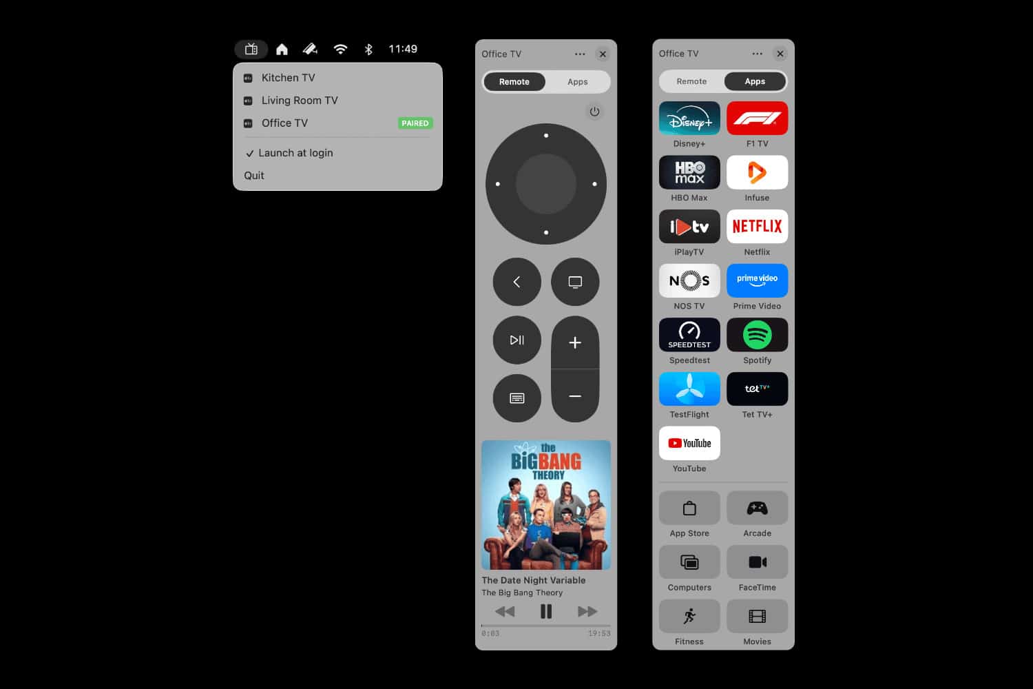 Im Zentrum steht ein App‑Launcher, der sämtliche installierten Apple‑TV‑Apps in einer kompakten Übersicht mit ihren vertrauten App‑Store‑Symbolen präsentiert. Ein Klick genügt, um eine Anwendung auf dem Fernseher zu starten. Gesteuert wird dabei fast ausschließlich über die Tastatur: Pfeiltasten, Return, Leertaste und Escape ersetzen die sonst obligatorische Fernbedienung. Wer will, legt die Hardware‑Remote zur Seite und navigiert ganz bequem und komplett vom Schreibtisch aus, ohne die Hand von der Tastatur nehmen zu müssen.
