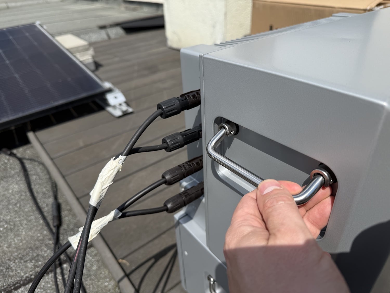 Um die Kabelverbindungen zu lösen, liegt im Lieferumfang des Jackery-Speichers ein kleines Werkzeug bei, das ohnehin zu eurer Grundausstattung zählen sollte. Damit löst ihr die beiden Kabel-Paare, die ihr am besten vorher zusammenklebt, vom bestehenden Wechselrichter. Danach werden die Kabel-Paare einfach an die vier Anschlüsse des Jackery HomePower 2000 Ultra gesteckt, hier kann man wirklich nichts verkehrt machen. Nun noch schnell das mitgelieferte Schuko-Kabel einstecken und mit der nächsten Steckdose verbinden. Das alles dauert, inklusive Auspacken, weniger als fünf Minuten.