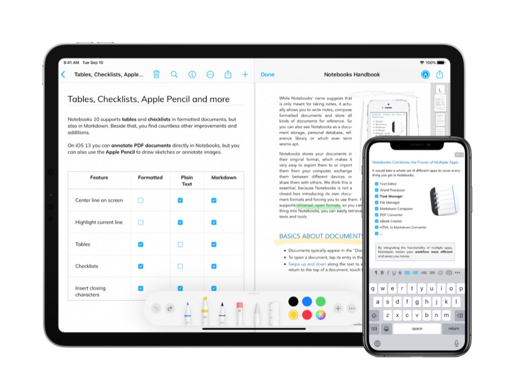 Auch wenn Apple die eigene Notiz-App mittlerweile um einige Features aufgewertet hat, setzen Power-User auch weiterhin auf Alternativen im App Store. Eine davon ist Notebooks, das schon seit einigen Jahren im deutschen App Store sowie für macOS verfügbar ist. Mit Version 10 der umfassenden Notiz-App wird es nun eine rundum erneuerte Anwendung geben. In Version 10 von Notebooks gibt es einige neue Features und Highlights, darunter eine Unterstützung für den Apple Pencil, eine Files.app-Integration, eine Apple Watch-App mit anstehenden Aufgaben und zum Hinzufügen von Notizen, einen Bildbetrachter, neue Dokument-Stile, Tabellen und Checklisten in formatierten Dokumenten, MultiMarkdown als alternativen Markdown-Converter, sowie ein Support für [ ] Checklisten und [[Wiki]] Style Links in Markdown. (App Store-Link)