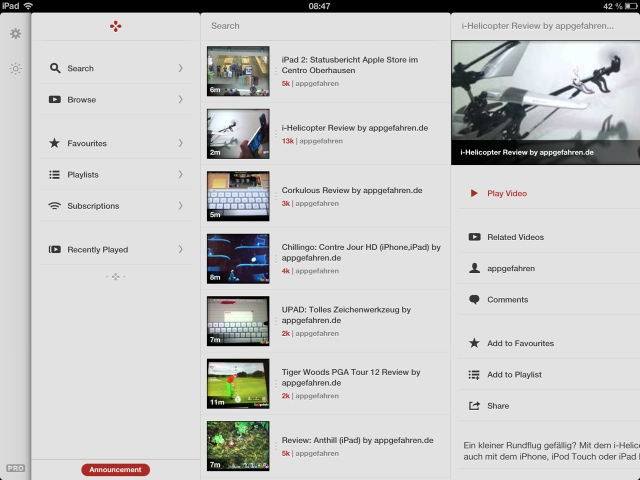 Das Layout von Jasmine ist sehr schlicht, sieht dafür aber gut aus. Der Funktionsumfang ist ausreichend und auf dem iPad macht der YouTube-Client eine noch bessere Figur, da die Darstellung und die Menüfürhung fürs iPad entwickelt wurden. Jasmine ist kostenlos und komplett werbefrei. Damit dies so bleibt gibt es die Möglichkeit auf eine Pro-Version upzugraden, was eher die Motivation ist, dass der Entwickler die App weiterhin werbefrei anbietet – allerdings funktioniert diese Funktion bei mir nicht, es gibt kein Popup-Fenster für den In-App-Kauf.