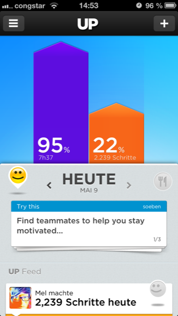 Da vieles in Gemeinschaft immer besser bewältigt werden kann, hat es sich Jawbone nicht nehmen lassen, auch soziale Aspekte mit in die UP-App einzubauen. So kann in den Kontakten nach anderen UP-Nutzern gesucht werden, die dann in einer Art Freundesliste, wie man sie von Facebook kennt, auftauchen. In einem Feed auf der Hauptseite wird man dann über die Aktivitäten der „UP-Partner“ eingehend informiert. Ob man das möchte, ist natürlich eine andere Sache. Ich zeichne meine Aktivitäten lieber für mich selbst auf, das genügt mir.