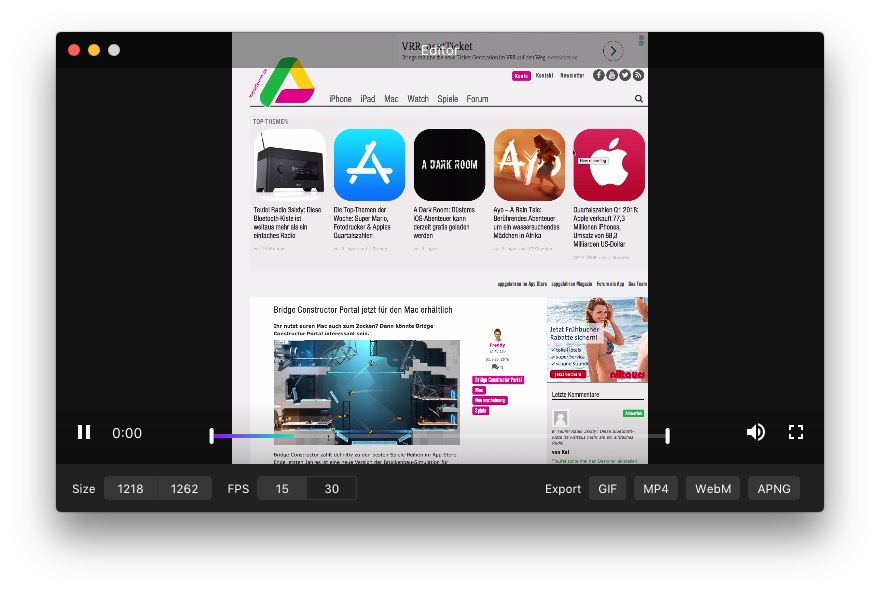 Die Handhabung von Kap ist dabei sehr einfach. Über die Menüleiste lässt sich eine Aufnahme starten, wobei neben vordefinierten Größen auch individuelle Ausschnitte gewählt werden können. Im Editor lässt sich wählen, ob die Aufnahme als GIF, MP4, WebM oder APNG exportiert werden soll.