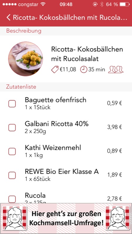 Jedes Rezept kommt neben der eigentlichen Kochanleitung mit einer Zutatenliste daher, in der die genaue Bezeichnung des Produkts angegeben ist. Für Ricotta-Kokosbällchen mit Rucolasalat von Rewe benötigt man unter anderem „Galbani Ricotta 40%“, „REWE Bio Eier Klasse A“ und „Wurzener Haferflocken zart“.