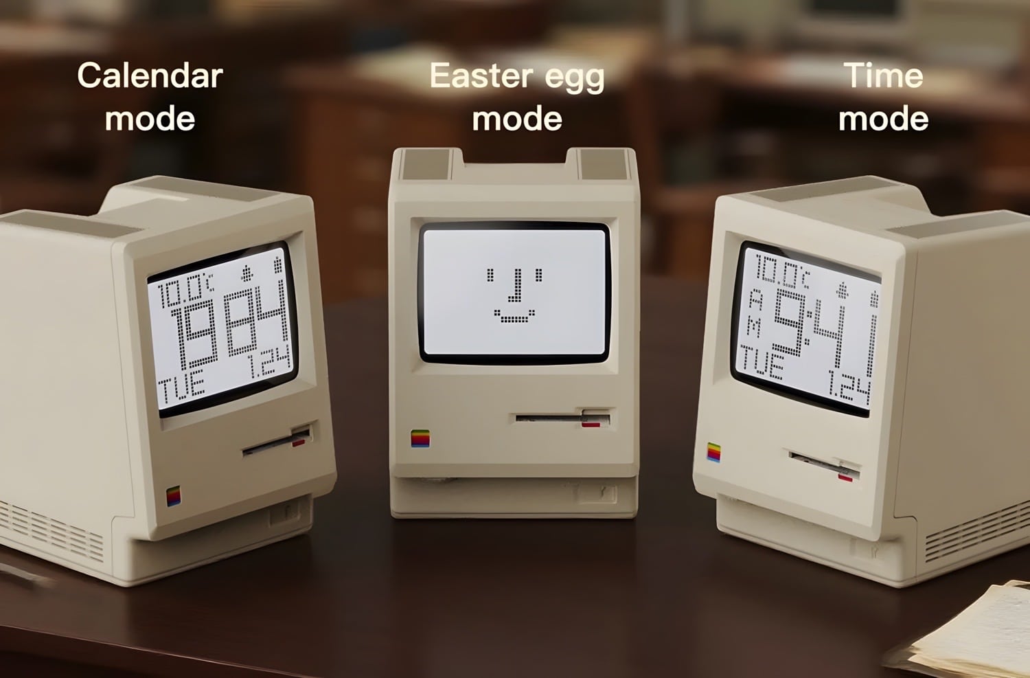 Die Maclock-Uhr bietet über den integrierten LCD-Bildschirm insgesamt drei Display-Modi, darunter einen „Easter Egg“-Modus mit Susan Kares Original „Happy Macintosh“-Icon, ebenso wie einen Zeit- und einen Kalender-Modus. Der Hersteller Kokogol beschreibt das Projekt als „eine Hommage an Klassiker, wiedergeboren in Pixeln“.