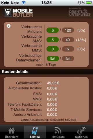 MobileButler ist wohl eine der beliebtesten Apps in Sachen Kostenkontrolle. Die Applikation listet verbrauchte Minuten, SMS und MMS auf, so dass man sein Guthaben immer im Blick hat. Des Weiteren können in der nNähe befindliche WiFi-Netzwerke geortet werden. Mit dem WiFi-Connection-Manager kann man sich kinderleicht mit einem T-Mobile HotSpot verbinden.