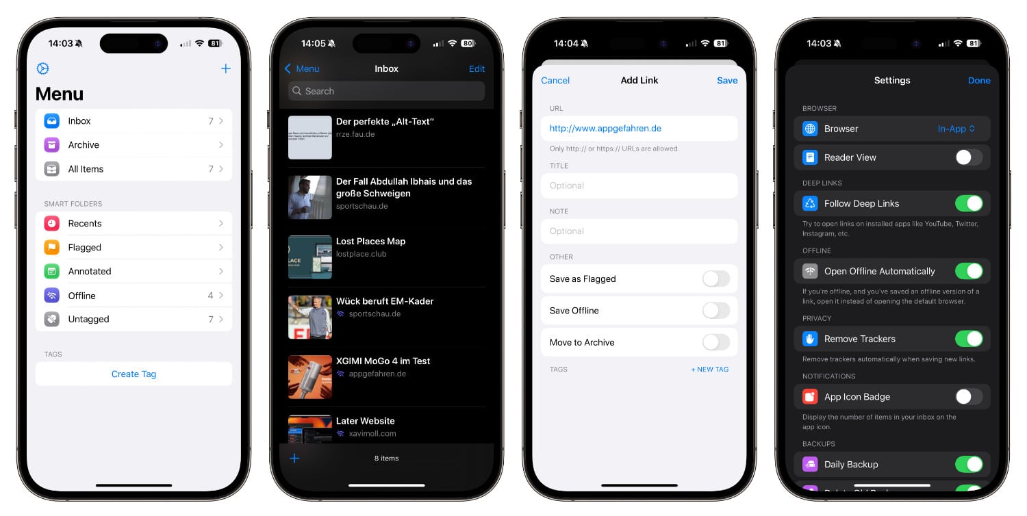 Möchte man dann in einem freien Moment gespeicherte Links wieder aufrufen und die entsprechenden Inhalte lesen, ist aber gerade unterwegs und ohne Internetverbindung, können angelegte Links mit Later auch ohne WLAN offline gelesen werden. Diese Option steht beim Erstellen eines Links bereit und ermöglicht es beispielsweise im Zug, Flugzeug oder während bestimmten Digital Detox-Szenarien auf die gesicherten Artikel auch ohne Datenverbindung zugreifen zu können.