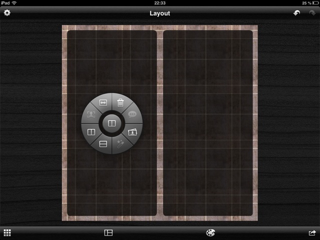 Mit einem Fingertipp auf die noch leere Fläche öffnet sich ein kreisrundes Menü, mit dem sich Inhalte einfügen, oder diese sich weiter bearbeiten lassen. So kann der Rahmen weiter aufgeteilt, oder auch eingefügte Bilder gelöscht oder mit Über-/Unterschriften versehen werden.