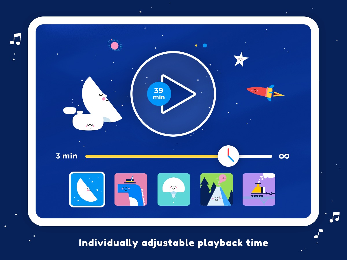 Little Slumber bietet ingesamt fünf spezielle Einschlafwelten, wobei die Musik von Christian Maier komponiert wurde. Die Lautstärke und die Helligkeit des Bildschirms werden über die Zeit automatisch angepasst, wobei ihr selbst einstellen könnt, wie lange die Musik abgespielt und die Animationen angezeigt werden.