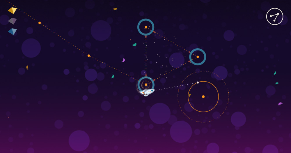 Die Steuerung lässt sich schnell und einfach erlernen und kann auch über nur einen Finger erfolgen. Das eigene kleine Raumschiff dreht sich kontinuierlich um einen Fixpunkt und kann im passenden Moment mittels einer Wischgeste in die entsprechende Richtung zum nächsten Punkt geflogen werden. Auf diese Weise bewegt man sich fort und sammelt unterwegs auch weitere Boni ein, die zur Freischaltung neuer Punkte auf der Reise notwendig sind.
