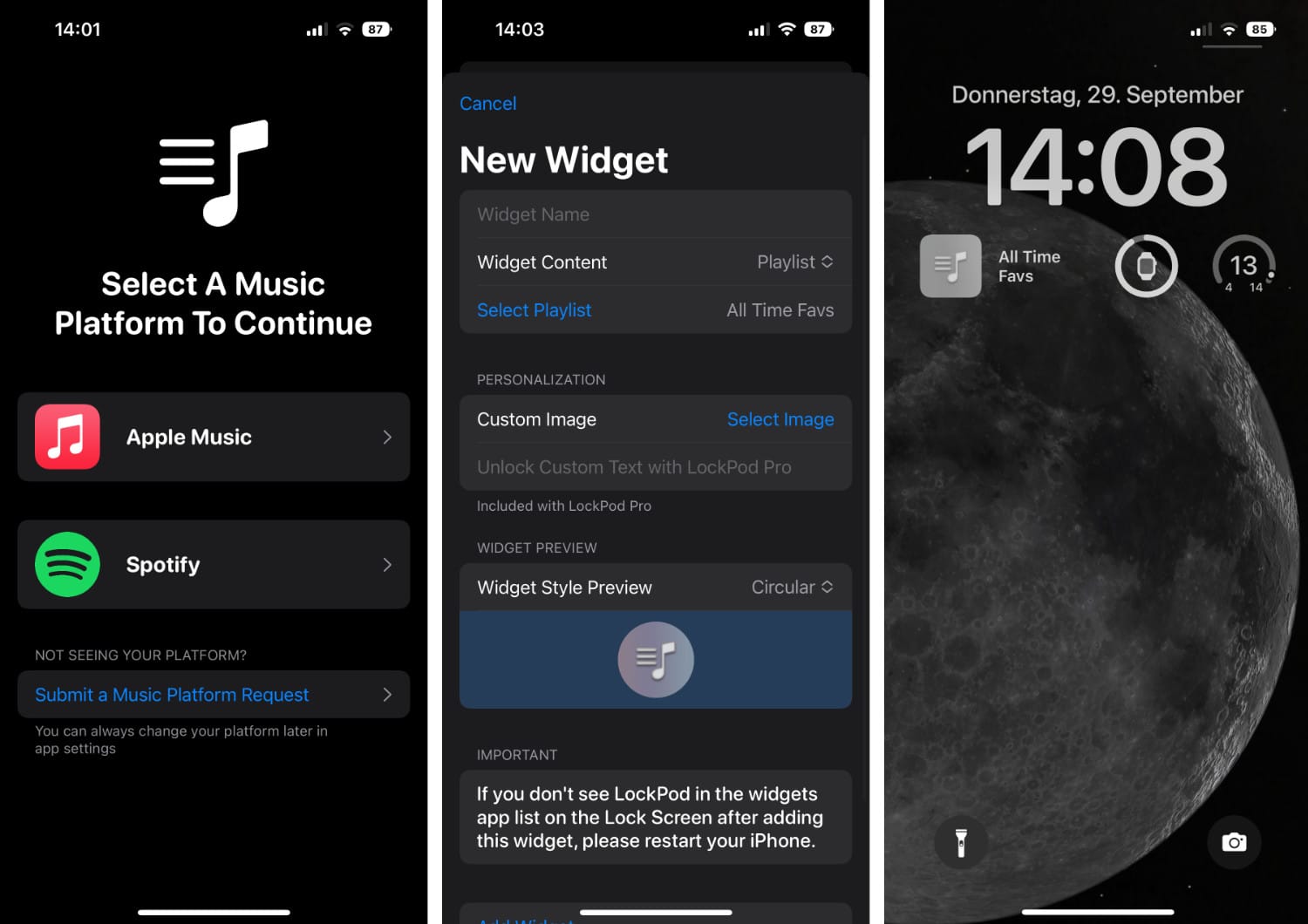 Ein Beispiel ist LockPod (App Store-Link) von Rishi Malhotra, das sich kostenlos auf das iPhone herunterladen lässt und es ermöglicht, Inhalte von den beiden Musikstreaming-Diensten Apple Music oder Spotify in einem kleinen Sperrbildschirm-Widget anzuzeigen. Man hat die Möglichkeit, sowohl rechteckige als auch kreisrunde Widgets anzulegen, mit ihnen ein Album, eine Playlist oder einen Radiosender zu verknüpfen und dem Ganzen dann einen Namen zu geben.
