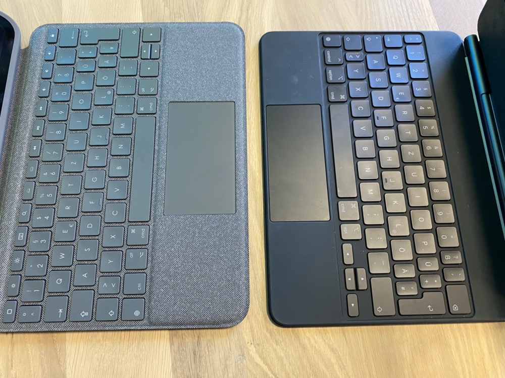 Das Trackpad: Von der reinen Größe her liegt Logitech hier knapp vorne, vor allem in der Höhe ist das Trackpad deutlich größer. Dafür lässt es sich im Gegensatz zur Lösung von Apple nicht überall nach drücken, sondern nur in der unteren Hälfte. Am Ende dürfte das aber nur eine Sache der Gewöhnung sein, somit liegen beide Modelle in etwa gleichauf.