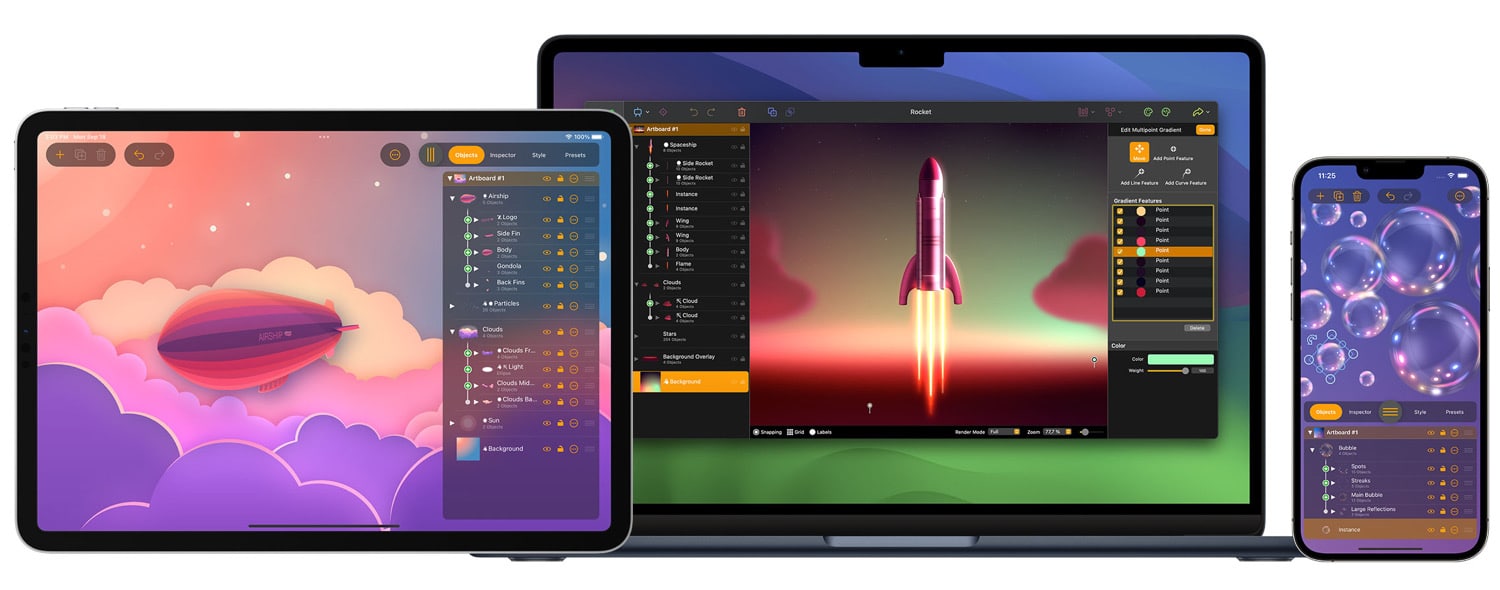 Die iPad- und iPhone-Versionen bringen eine komplett eigene, auf Mobilgeräte angepasste Benutzeroberfläche und zudem den fast vollständigen Funktionsumfang der Mac-Version mit: Es handelt sich um eine vollwertige Vektor-Design-App. Darüber hinaus sind Dokumente zwischen der Mac- und iPhone-/iPad-Version vollständig kompatibel und erstellte Dokumente zwischen Apple-Geräten über iCloud Drive synchronisierbar. Auch eine Unterstützung von mehreren Fenstern oder geöffneten Dokumenten auf iPadOS – inklusive Stage Manager – ist vorhanden.