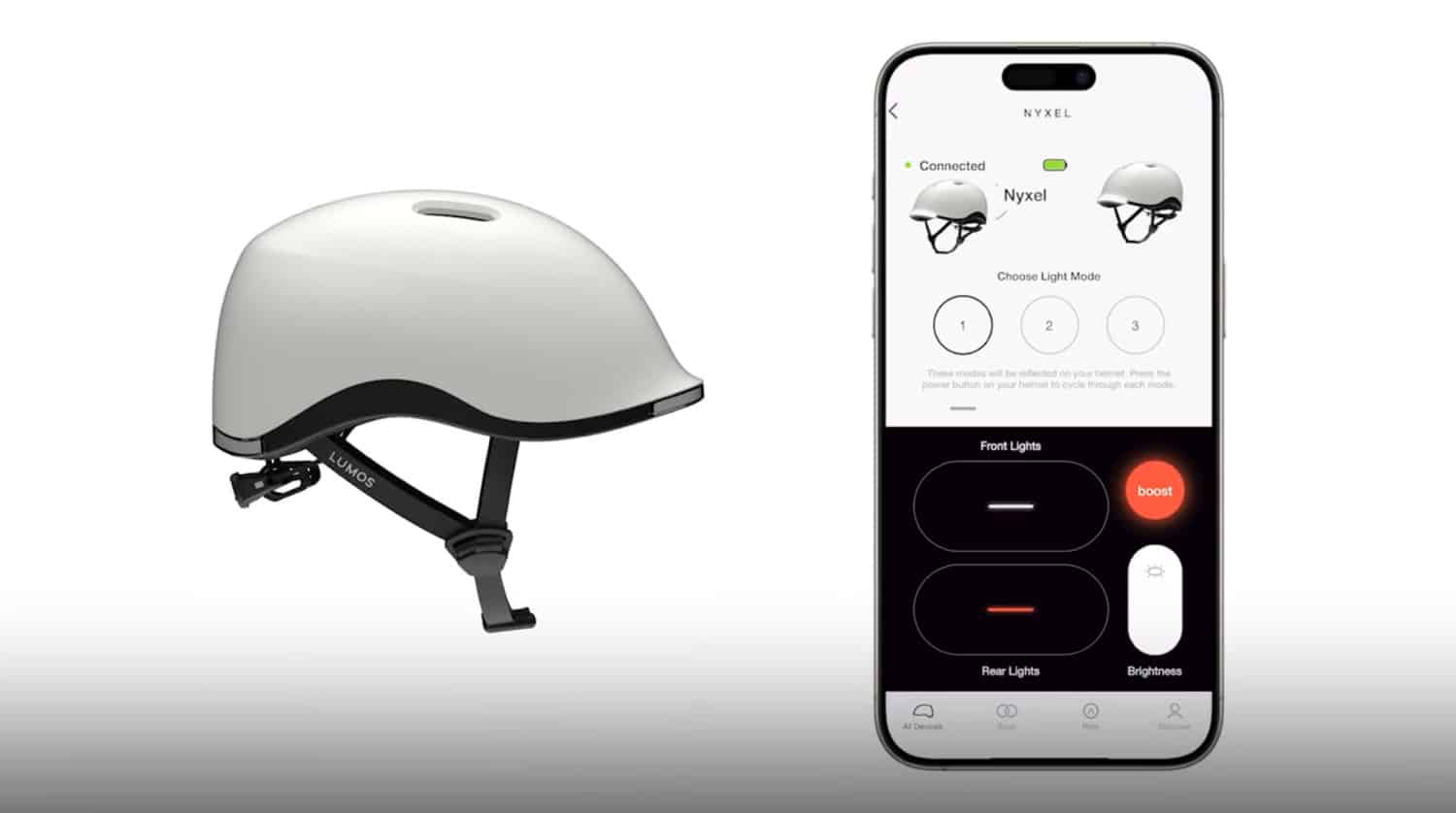 Der Lumos Nyxel verfügt dank ins Helmdesign integrierter Front- und Rücklichter über eine 360 Grad-Sichtbarkeit auf der Straße und kommt nicht nur mit einem intelligenten Bremslicht daher, sondern auch mit Blinklichtern für das Vorder- und Rücklicht. „Zeige allen um dir herum klar und deutlich deine Absichten an“, heißt es von Lumos. „Verringere das Risiko von Unfällen, indem du deine Bewegungen vorhersehbar machst.“ Aufgeladen wird der smarte Helm über einen simplen USB-C-Anschluss auf der Rückseite.