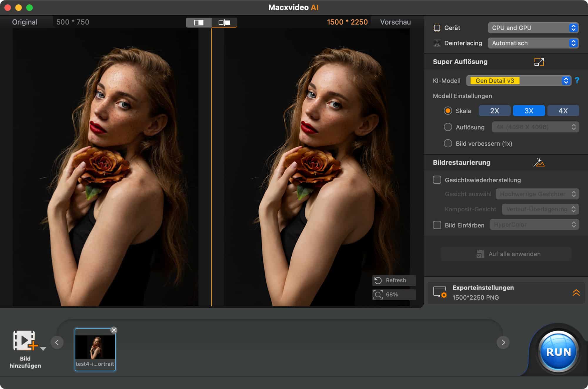 Auf der rechten Seite könnt ihr zum Beispiel das KI-Modell auswählen – je nach Foto oder Video können andere Modelle sinnvoller sein, die zum Beispiel besonders gut Gesichter aufhübschen. Darüber hinaus könnt ihr auch die Auflösung individuell bestimmen, denn nicht immer benötigt man 8K- oder 10K-Inhalte.