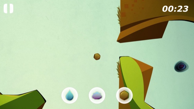In jedem Level kann man zwischen den Elemente beliebig oft hin- und herwechseln, ohne einen Wechsel könnte man die meisten Level auch nicht bestehen. Zum Start sucht man sich aus, ob man als Wassertropfen, als Wolke oder als Stein ins Level geschmissen wird. Am unteren Displayrand befinden sich drei Buttons, die die Elemente darstellen und mit einem Klick kann man sich in das entsprechende Objekt verwandeln. Mit dem Wassertropfen gleitet man durch die Welten, die Wolke kann natürlich fliegen und der Stein rollt und springt über die Landschaft.