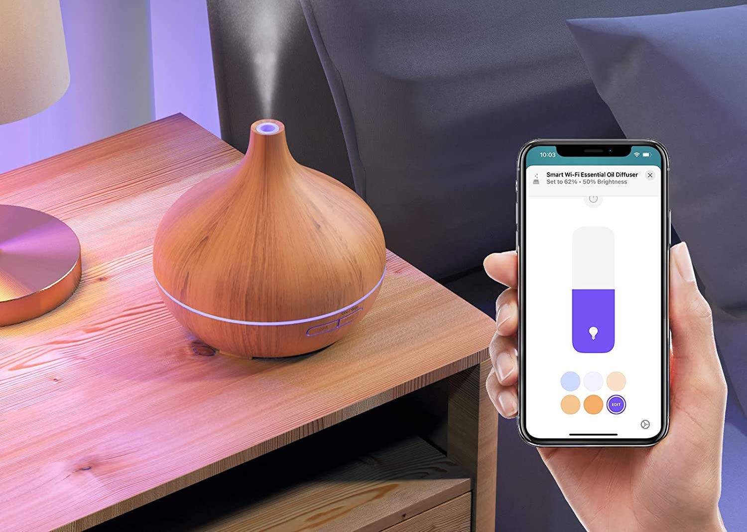 Durch die Anbindung an HomeKit könnt ihr das Gerät jederzeit per Home-App oder Siri starten oder beenden. Gleichzeitig gibt es noch einen LED-Ring, der ebenfalls smart steuerbar ist. Zudem sind Timing-Funktionen mit dabei, unter anderem kann man den Diffuser anhand des Sonnenauf- und Sonnenuntergangs steuern oder einen eigenen Zeitplan anlegen. Eine manuelle Steuerung über die Knöpfe am Gerät abseits der App-Steuerung ist auch möglich. Sollte das Wasser komplett aufgebraucht sein, schaltet sich das Gerät automatisch ab.