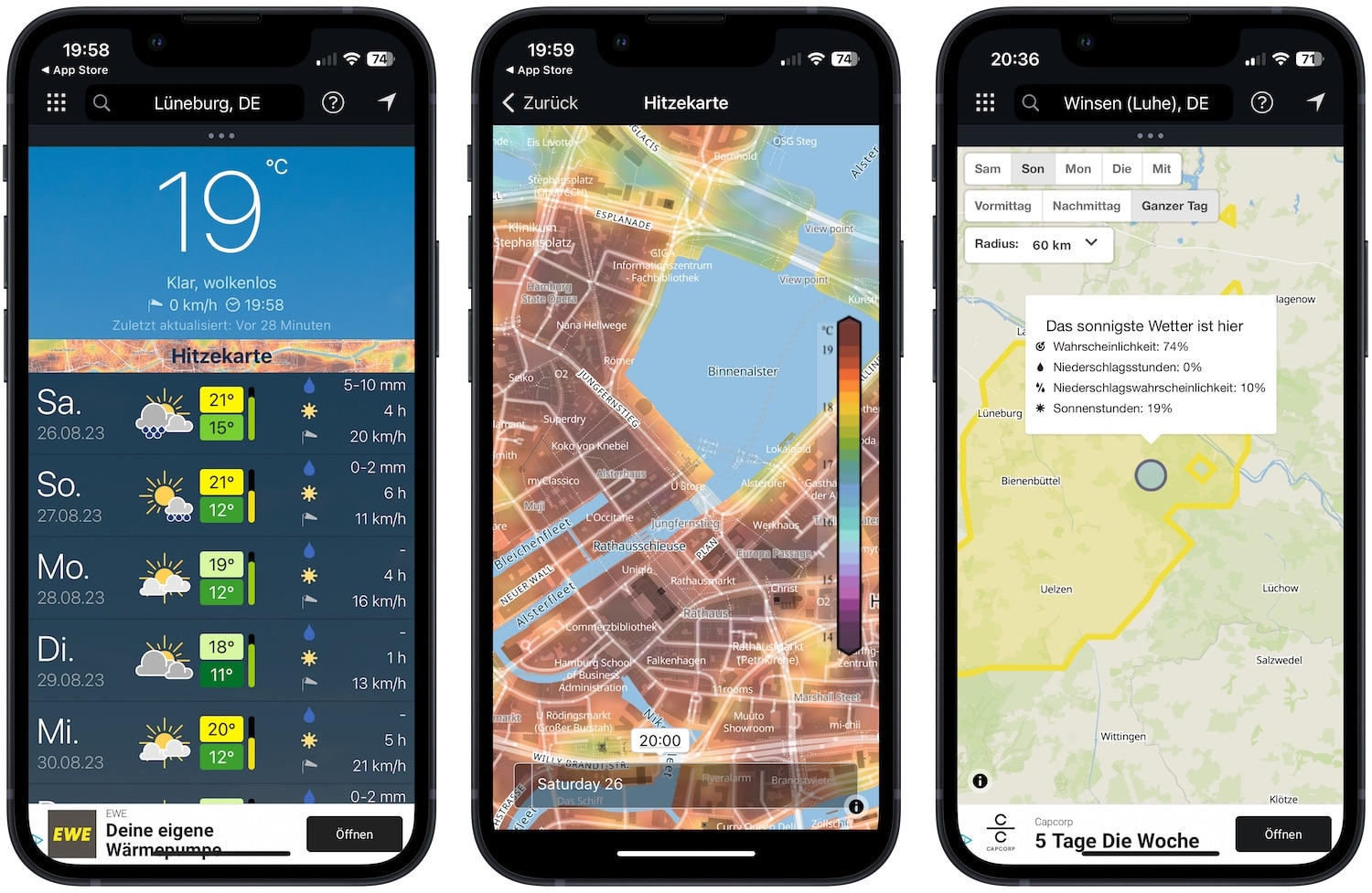Wem Apples Wetter-App schon zu oft daneben lag (willkommen im Club), mag sich vielleicht die Alternative Meteoblue (App-Store-Link) ansehen. Die App liefert zuverlässige Wetterdaten – natürlich so zuverlässig wie Wetterdaten eben sein können – und hat unter anderem eine Hitzekarte und eine Schönwettersuche im Angebot.