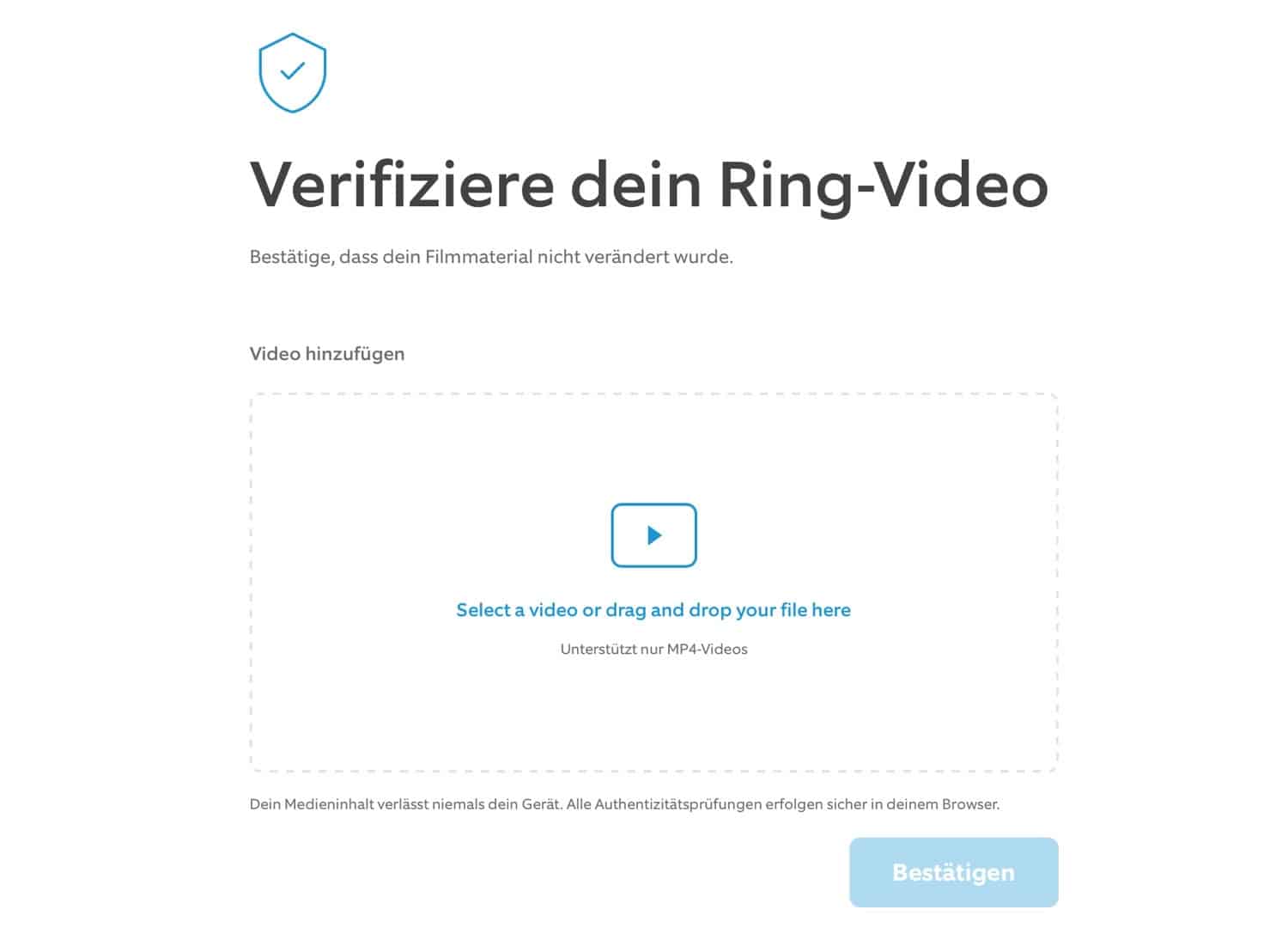 Personen, die ein Ring-Video zur Verfügung gestellt bekommen haben, können über die oben verlinkte Website die entsprechende Videodatei im Browser hochladen und überprüfen lassen. Amazon gibt an, dass die Videos nicht auf die Server des Unternehmens hochgeladen werden, sondern lediglich die digitale Signatur des Videoclips abgeglichen werde. So soll festgestellt werden, ob es sich um eine Originaldatei von einer Ring-Kamera handelt oder nicht. Zudem muss das Video im MP4-Format vorliegen.