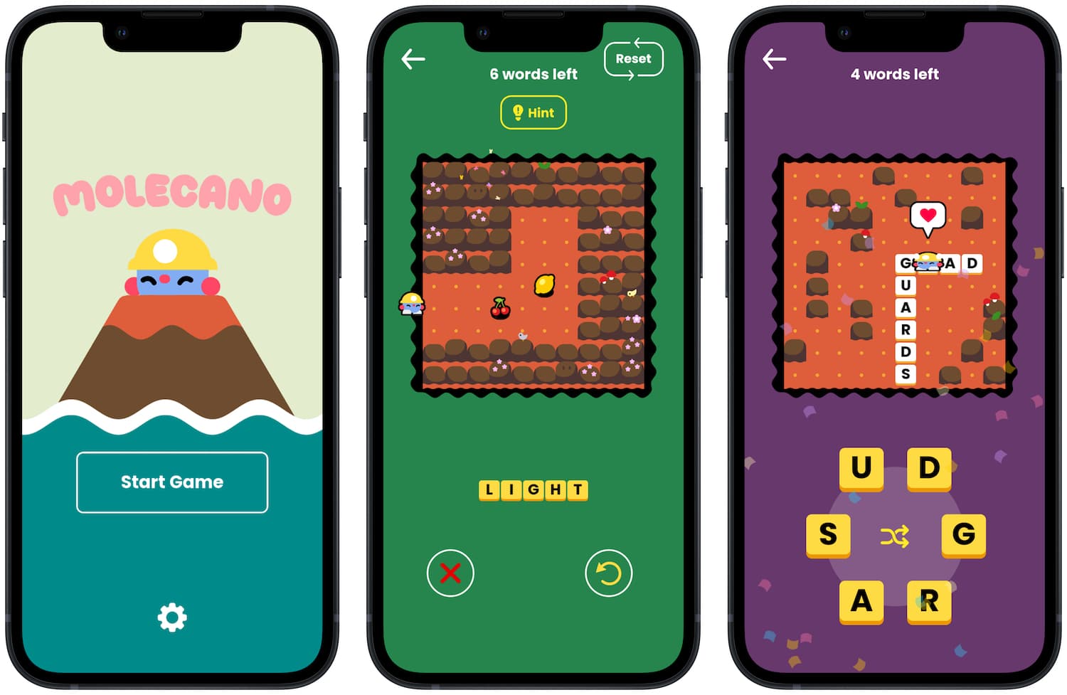 Aus sechs Buchstaben gilt es in Molecano Worte zu formen. Pro Runde dürfen es bis zu sechs Begriffe sein, die ihr verwenden könnt, um Molene den Weg über das Spielbrett zu bahnen. Für Wörter mit fünf oder sechs Buchstaben gibt es Extrapunkte. In der aktuellen Spielversion sind 400 Rätsel enthalten, mehr sollen folgen, schreibt der Entwickler in der App-Store-Beschreibung.