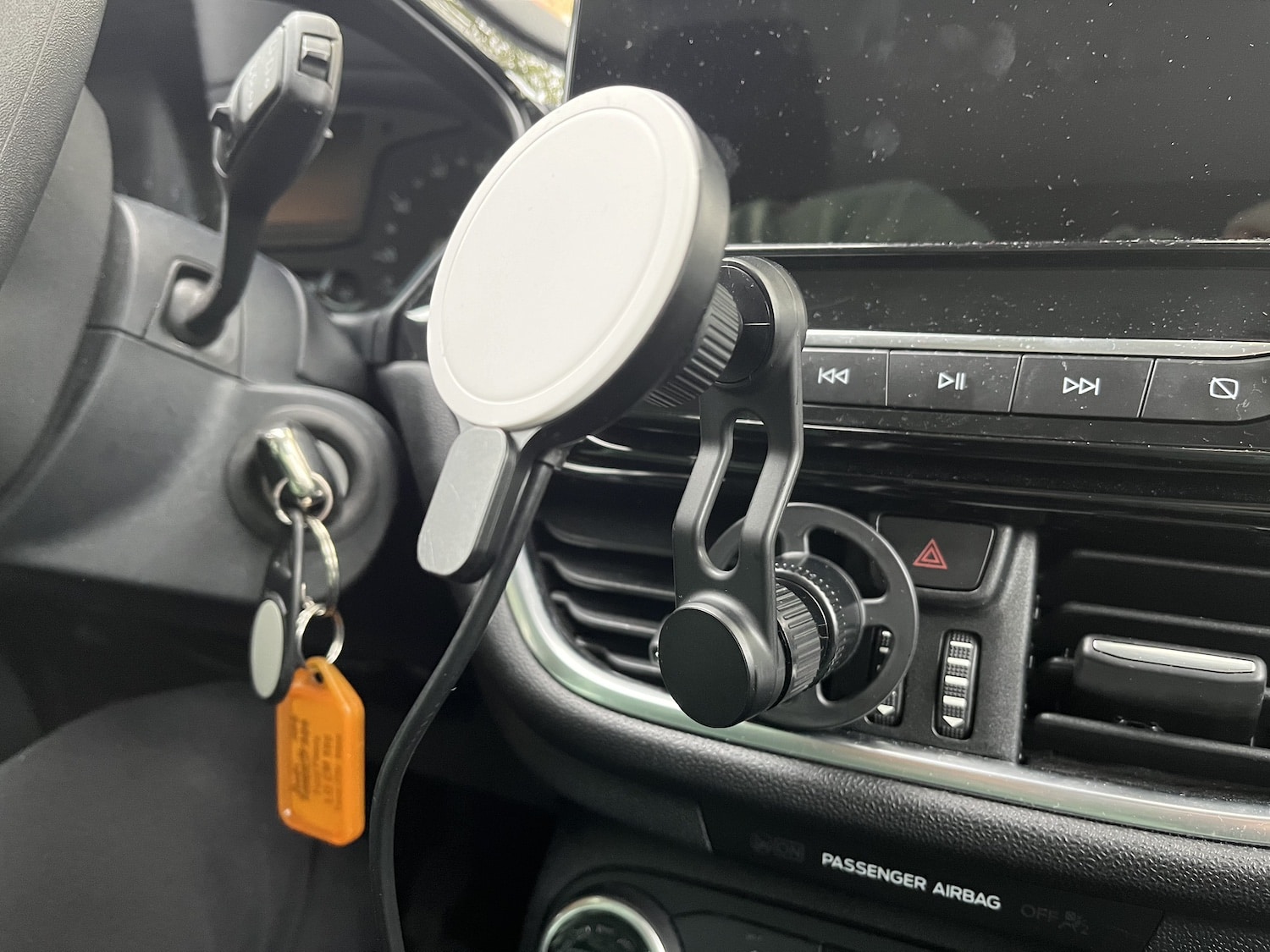 Das Aufladen via MagSafe klappt tadellos und auch das Arretieren des Verlängerungsarms klappt ohne Probleme. Was mich aber beim Fahren gestört hat, waren zwei Dinge: Das Kabel und die Position des „Vent Mounts“. Wollt ihr via MagSafe aufladen, müsst ihr die Halterung natürlich via Kabel mit dem Auto verbinden. Dazu könnt ihr entweder den Adapter für den Zigarettenanzünder benutzen oder falls euer Wagen einen USB-C-Anschluss hat auch diesen verwenden. Zwar ist im Lieferumfang ein sogenannter „Kabel-Management-Clip“ enthalten, aber in meinem Fall baumelte das Kabel immer noch zu nah am Schalthebel herum.