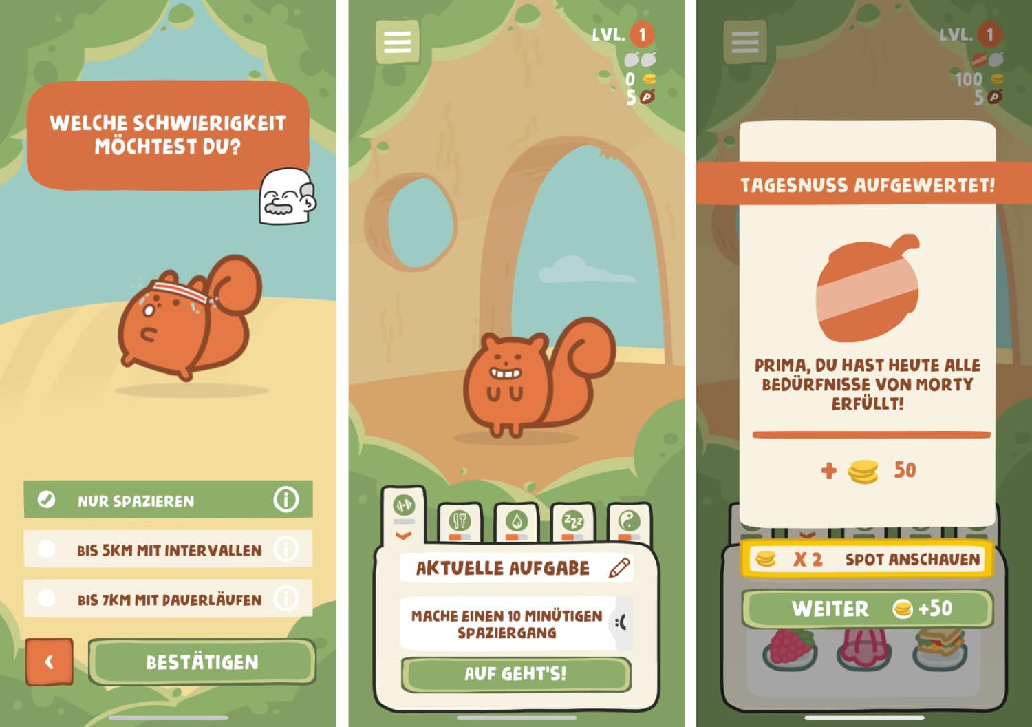 Das Grundprinzip von Morty – Das Motivationshörnchen besteht aus je nach Motivationsziel unterschiedlichen Aufgaben, die an festgelegten Tagen erledigt werden müssen. User müssen, beispielsweise bei der Zielsetzung „mehr bewegen“, an selbst ausgewählten Tagen einen 10-minütigen Spaziergang erledigen oder aber 3.000 Schritte gehen, um ihr Morty glücklich zu machen.