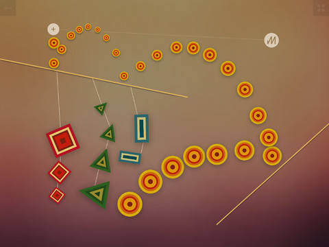 Auf dem Startbildschirm werden bereits einige Beispiele gezeigt, um vor seinem ersten Versuch ein Gefühl für die Musik zu bekommen. Startet man einen neuen Song, kann man alles selber bestimmen. Die Zahl der Möglichkeiten die vielen Elemente zu verbinden ist schier endlos. Alle Elemente befinden sich am rechten Bildschirmrand und lassen sich in beliebiger Anzahl einfügen. Hier lassen sich zum Beispiel Linien auswählen, auf denen die Elemente sich bewegen sollen. Hat man ein paar Linien platziert, kann man ein paar Elemente auswählen und diese darauf positionieren.